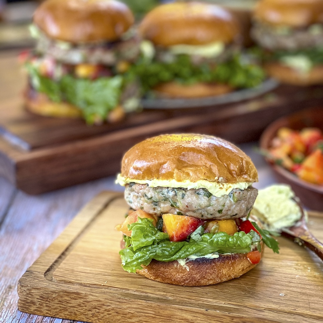 - Smear toasted buns with herb cheese mustard spread then layer with lettuce, peach salsa, chicken burger and top bun.