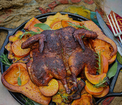 - Place the rimmed pan with squash and oranges over direct heat. Place the chicken over indirect heat, with the chicken legs pointing towards the heat and the chicken breast near the outer rim of the grill. Close dome. You may have to rotate the chicken if the breasts take a little too long to finish.